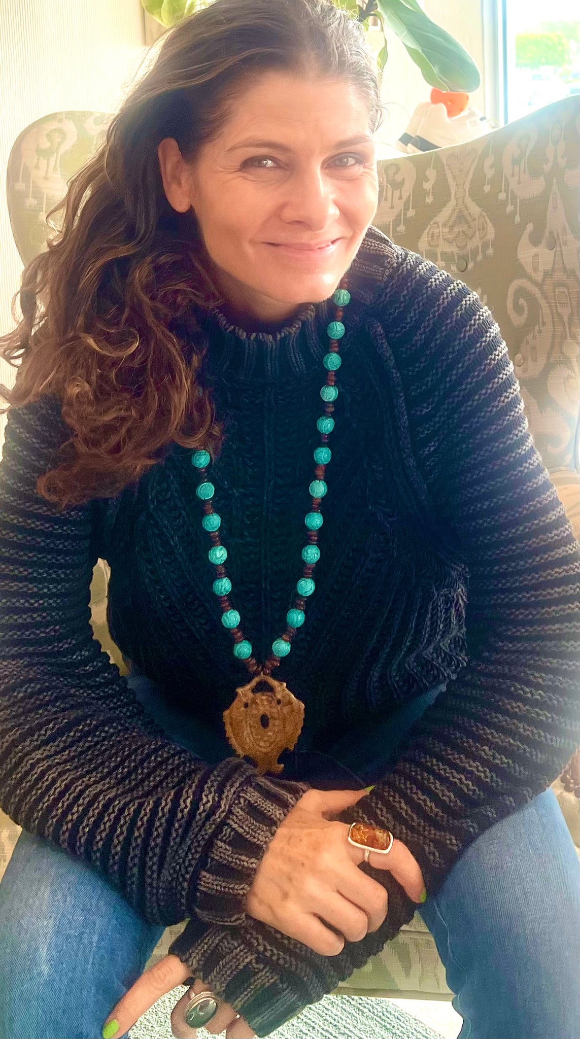 Round Chinese turquoise with Chinese carvings with 3x amber roundelles in between & a gigantic double Koi fish yellow jade pendant attached at the center necklace. 32″
