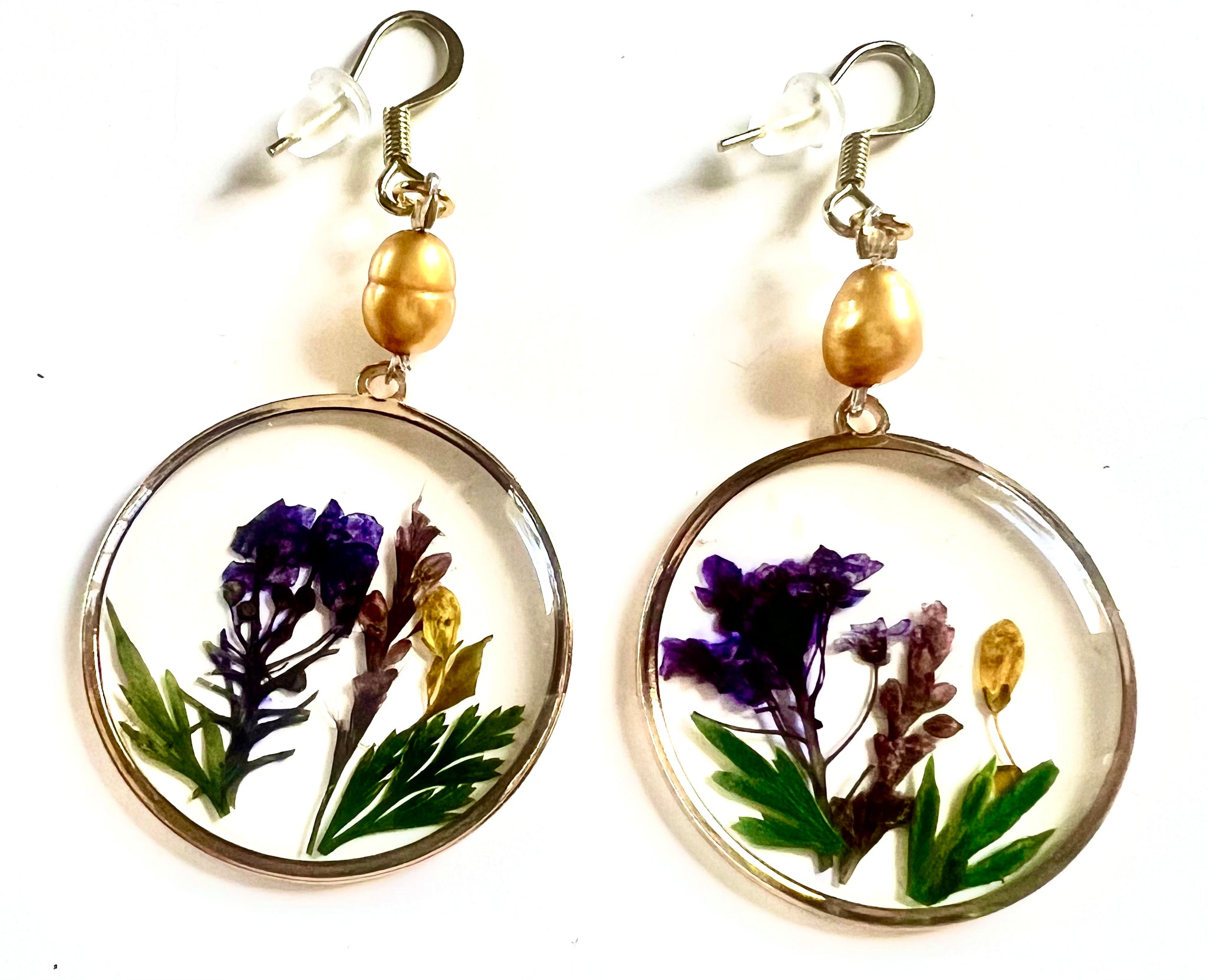 Clear round disc with gold trim edging with purple and yellow dried flowers & green leaves inside the clear glass disc. Attached with a gold yellow blister pearl and the tip earrings.